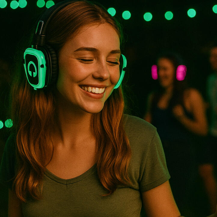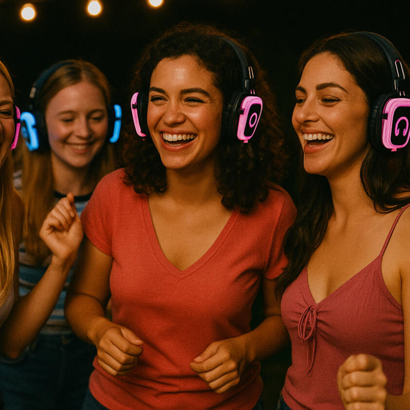 A silent disco is a party where everyone’s dancing like crazy… but in total silence. Each person wears glowing headphones and can switch between music channels - so your bestie might be raving to Beyoncé while you’re vibing to Drake. No noise, no neighbour drama, just good tunes, bad dance moves and full-volume fun!
