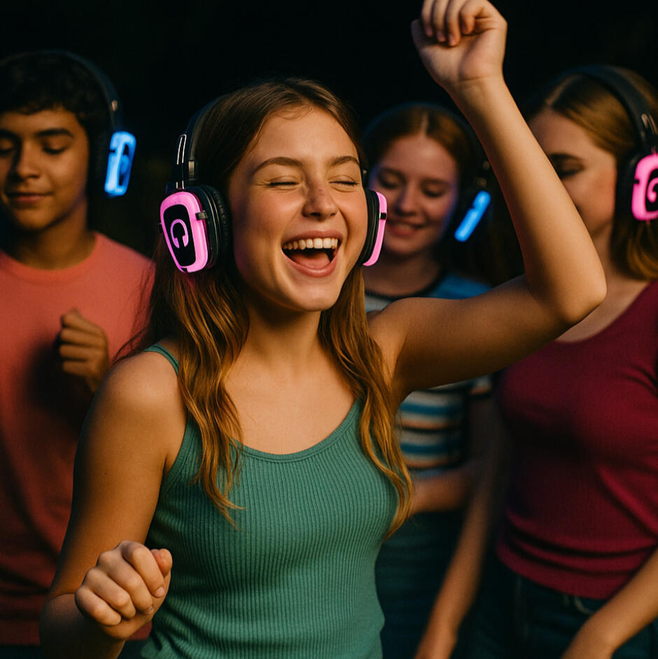 A silent disco is a party where everyone’s dancing like crazy… but in total silence. Each person wears glowing headphones and can switch between music channels - so your bestie might be raving to Beyoncé while you’re vibing to Drake. No noise, no neighbour drama, just good tunes, bad dance moves and full-volume fun!
